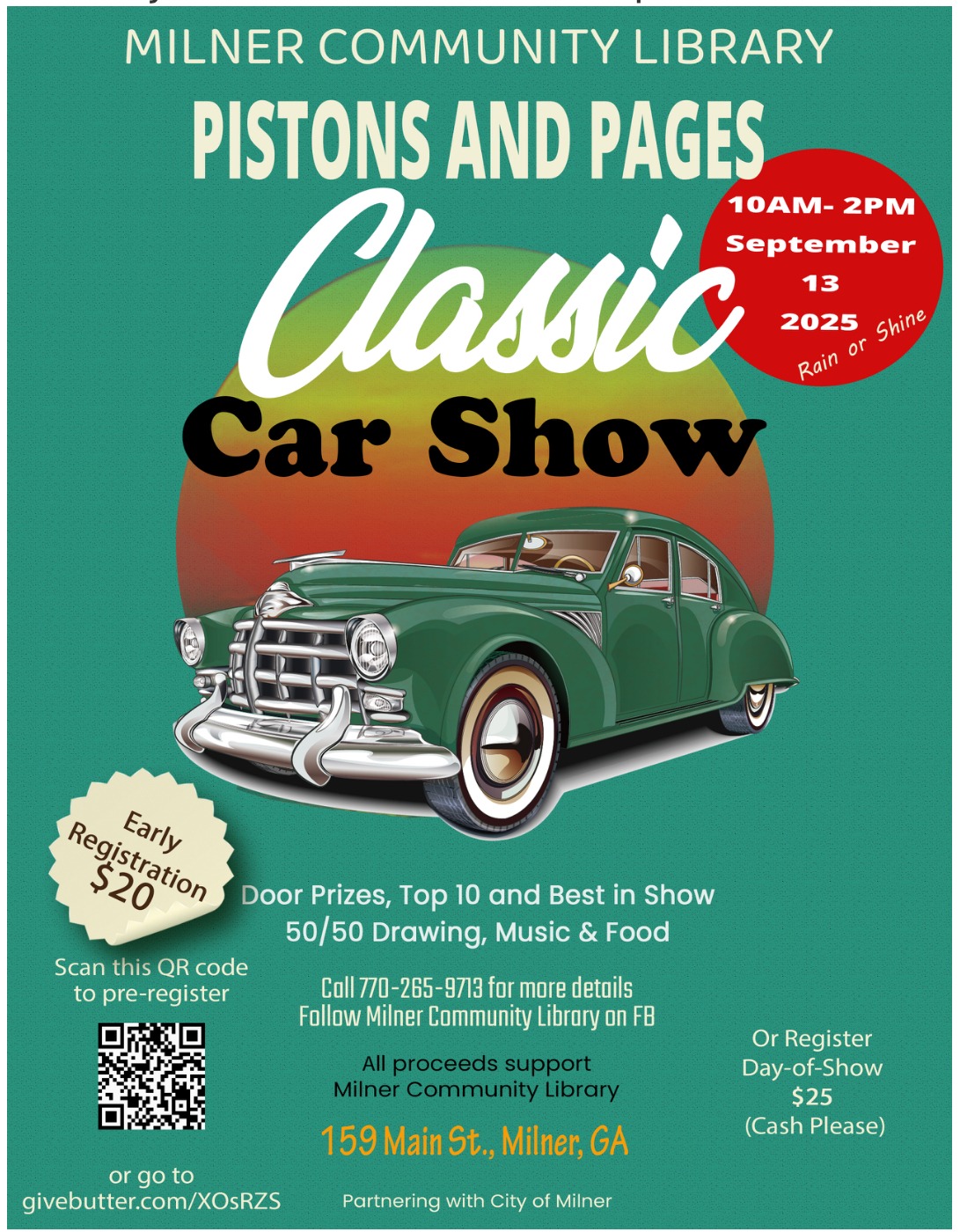 Home/ « All Events This event has passed. Piston & Pages Classic Car Show September 13 @ 10:00 am - 2:00 pm « Touch-A-Truck – September 13 Mountain run! » Use the QR code to preregister for the car show. Add to calendar Google Calendar iCalendar Outlook 365 Outlook Live Details Date: September 13 Time: 10:00 am - 2:00 pm Event Categories: Car Shows, Meets, Club Meets, Cruise Ins Website: https://www.facebook.com/events/24266194672983969/ Organizer Milner Community Library Email noreply@facebookmail.com Venue 159 Main Street, Milner, GA, United States, Georgia 30257