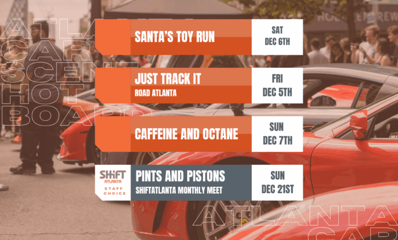 December 2025 Hot Board of Events as voted on by the members of Atlanta Car Scene. Each month the members of Atlanta Car Scene vote for their favorite car shows, meets, track days, organized drives and other car events. The top 3 vote getters plus a ShiftAtlanta team selected favorite event is picked each month.