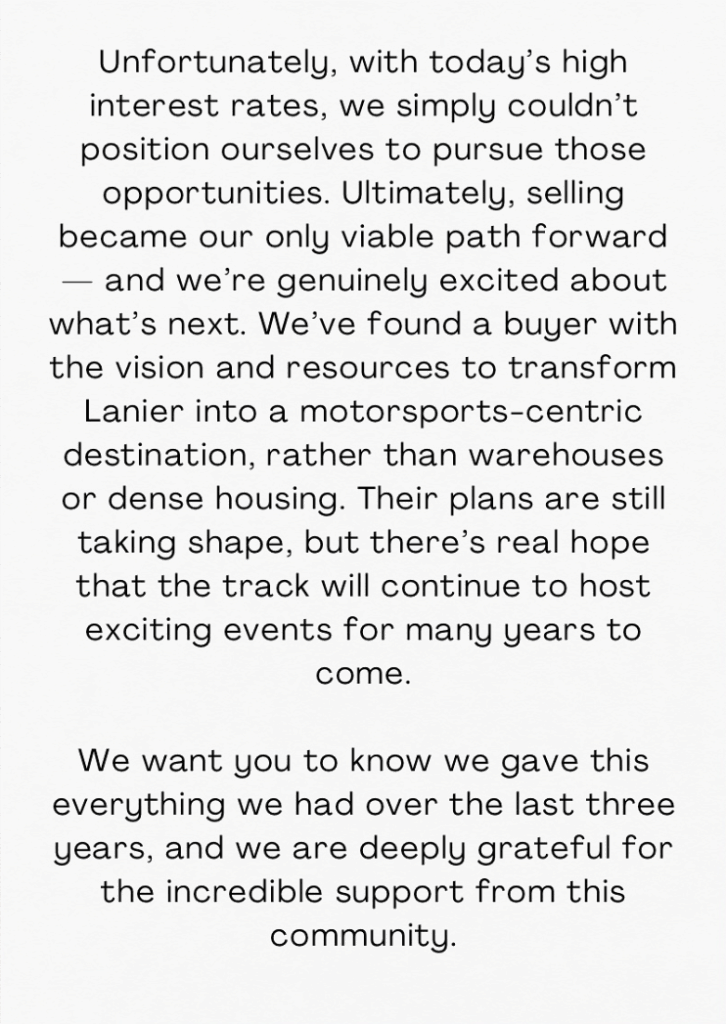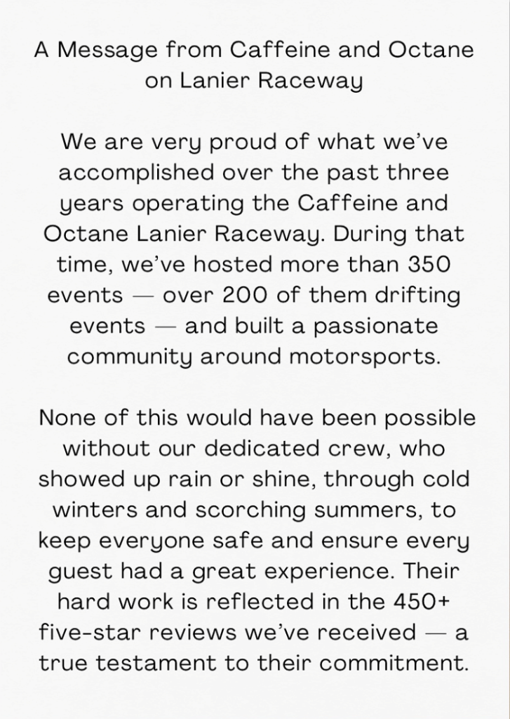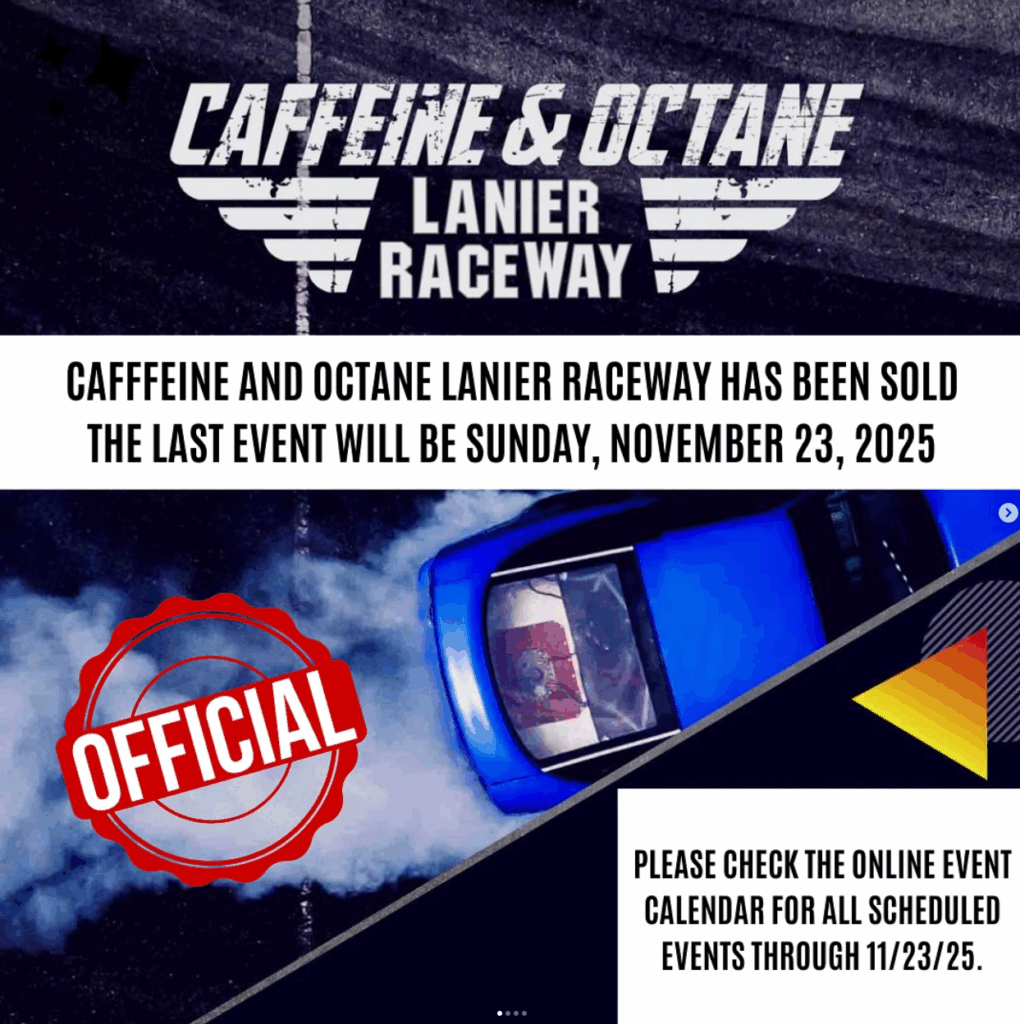 Update: 10/6 – 6:30pm – Caffeine and Octane Lanier official Instagram account posted the following image confirming the raceway had been sold. No additional details have been received from the owners of the redevelopment site (Editors Note: see comment above) or Caffeine and Octane on whether the plan is to revisit the redevelopment seen on the site or if the new owners have another plan.