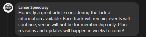Editors Note: As of the evening of 10/6 the Lanier Speedway page clarified that they do not extend for the facility to be entirely private.