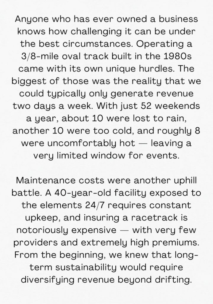 “Race track will remain, events will continue, venue will not be for membership only. Plan revisions and updates will happen in weeks to come!”