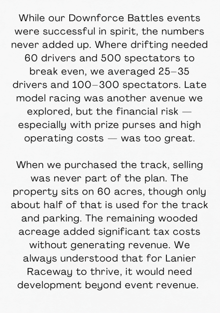 While it’s certainly possible, maybe even likely, the owners or a new entity has, or is planning to bring back plans to redevelop the site. But we don’t expect it will be exactly like what is currently being showen on the Lanier Speedway website. First, the plan itself seems to have been unchanged. In the world of development, it’s very rare a plan that was shot down comes back in nearly identical form. Whether that is good news, or bad news, for the future of the track we just don’t know. Outside of that rumor of the track going private, we’ve not seen anything to quantify a change in status.