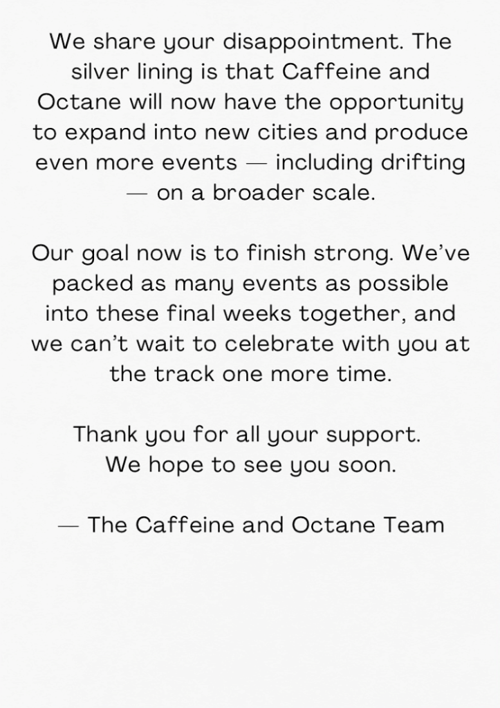 Update: 10/16 – Caffeine and Octane posted a detailed statement on their Instagram account.